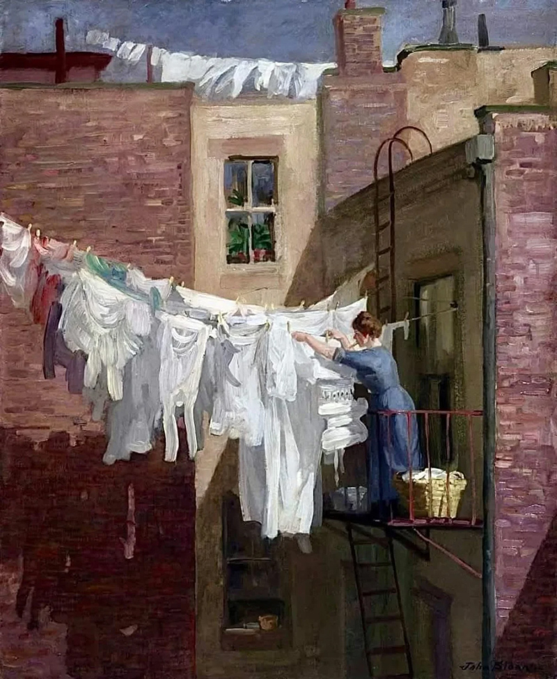 Allí estaba ella, desplegando ropa recién lavada: blusas, enaguas, ropa blanca… y tomándola con broches.